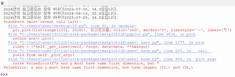 ValueError: x and y must have same first dimension, but have shapes (55,) and (56,)