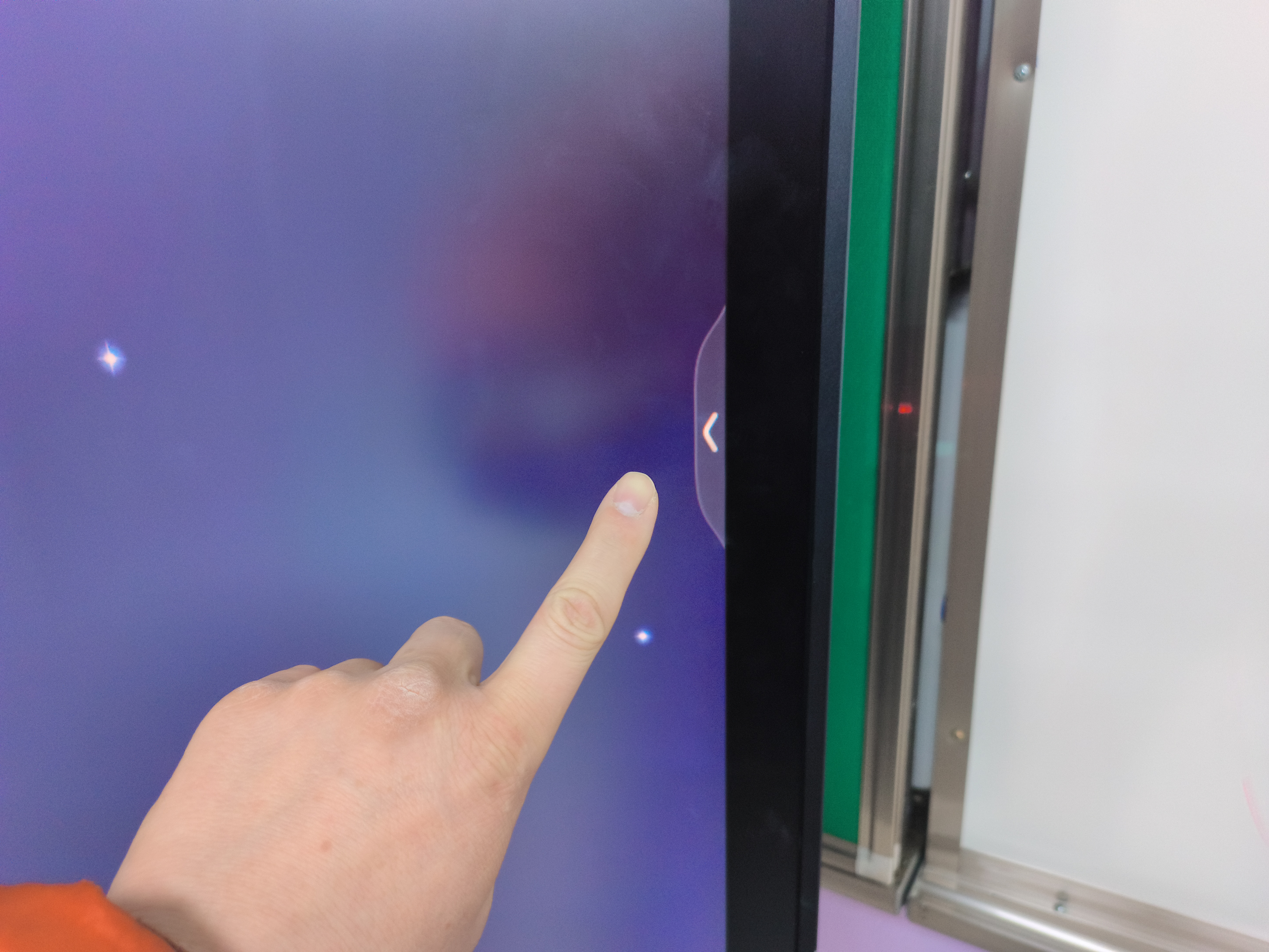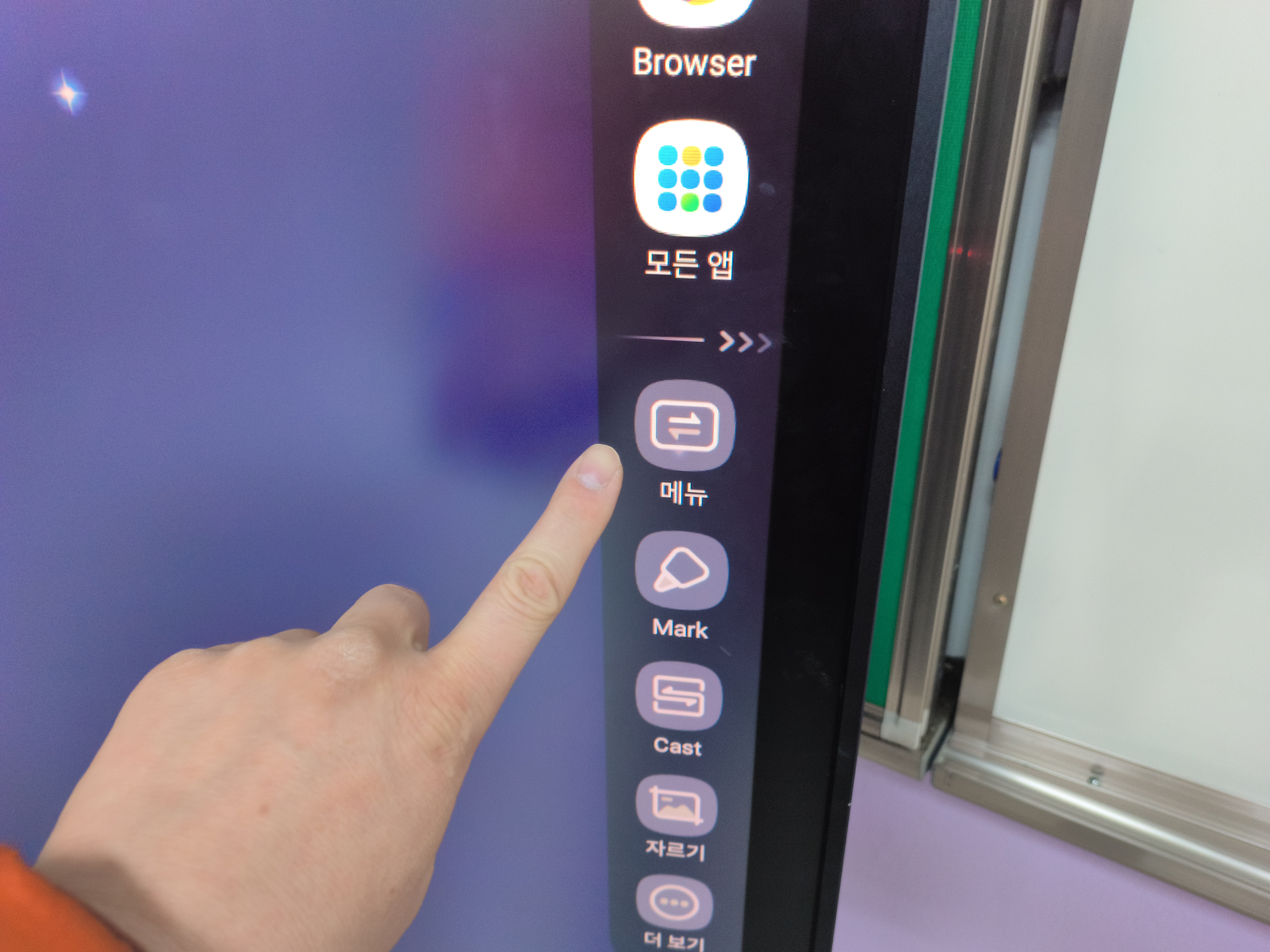 | HDMI 케이블 꽂으면 그 즉시 노트북 화면을 인식하기도 합니다만 만약 반응이 없다면, 칠판 오른쪽 중앙의 < 표시를 터치합니다. 칠판 왼쪽 중앙에 있는 > 표시를 터치해도 됩니다. ![]() |