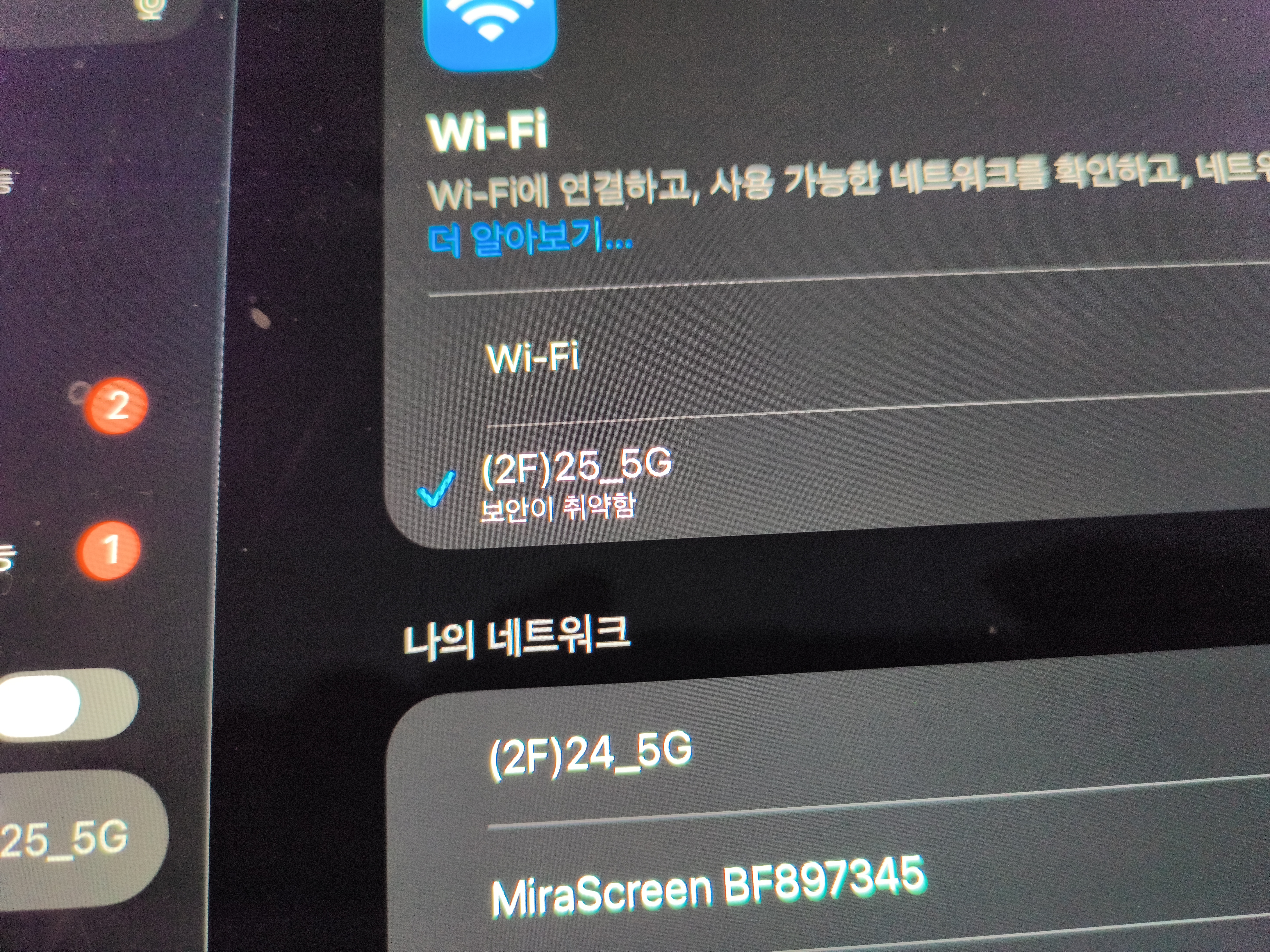 | 태블릿 활용 - 아이패드 칠판의 메뉴 아이콘을 터치한 후 HDMI2 아이콘을 터치합니다. 교실의 무선 AP에 접속합니다. 칠판의 미러링 장비도 여기에 접속해있기 때문에 반드시 (2F)25_5G에 접속해야 합니다. ![]() |